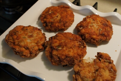 2. Form into 5, evenly=sized patties. In a large skillet over medium heat, heat oil. Cook patties in batches until golden brown and crispy, 3-4 minutes per side. Drain on paper towels.