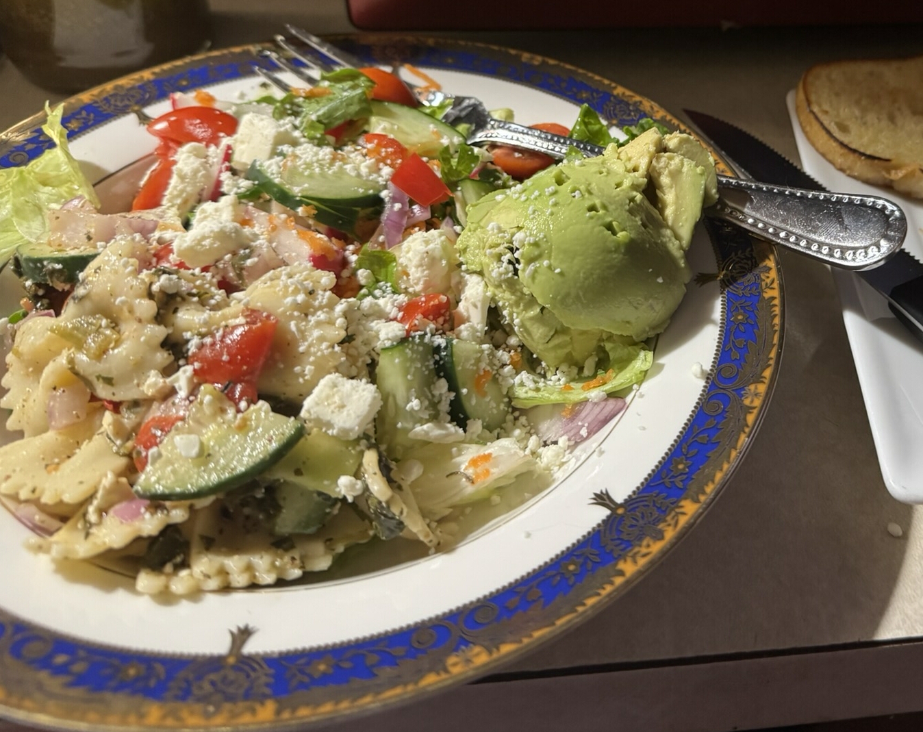 2 cups cooked bow pasta 1/2 cup cherry tomatoes, halved 1/4 cup red onion, slivered 1/2 cucumber, chopped 1/4 cup red bell pepper, chopped 1 cup spinach leaves, chopped 1/2 cup whole Black olives Feta Cheese