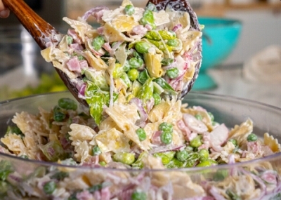 In a large trifle bowl or glass dish, mix all salad ingredients.